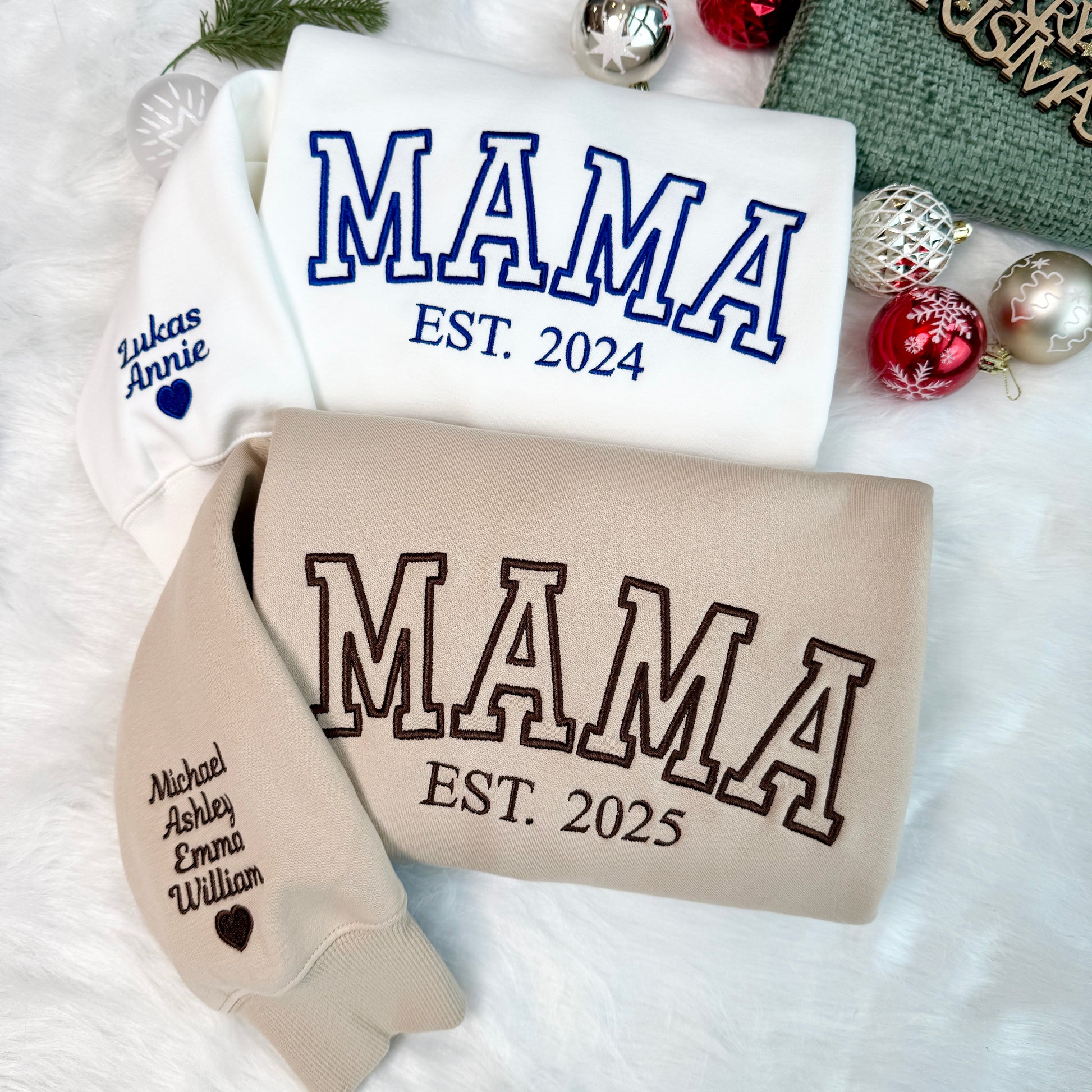 You can personalize the front nickname (like MAMA, MOMMY, NANA, MIMI, or anything you call her đ), add a custom EST. year, and even embroider the childrenâs or family membersâ names on the sleeve for that perfect heartfelt touch.